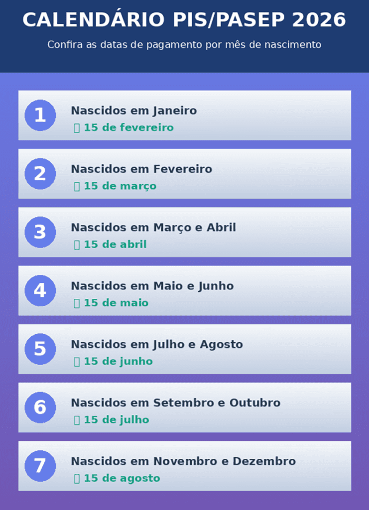 Seguindo o modelo de anos anteriores, os pagamentos são liberados de forma escalonada de acordo com o mês de nascimento do beneficiário (diferente do sistema antigo, que usava o número final da inscrição). O cronograma geralmente se estende até agosto, com o prazo final de saque para todos os grupos estabelecido para o dia 30 de dezembro de 2026.
